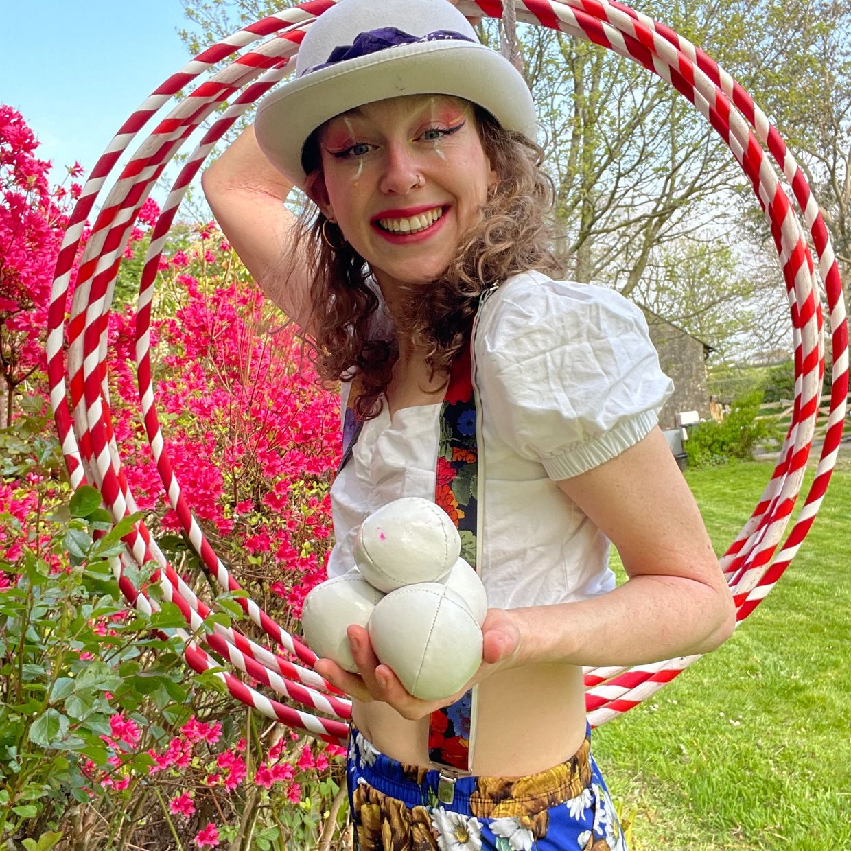 Nutmeg has a 20 minute show that she performs at birthday parties and other cool events! The show includes hat juggling, spinning plates, contact juggling, a 6 hoop act and of course - lots of clowning!